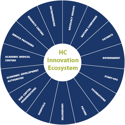 We offer collaboration and consulting services to grow high performing healthcare innovation ecosystems. We provide hands-on support from experienced faculty and content experts, access to the tools for forming and managing consortia, connecting networks, soliciting and selecting projects for seed funding, providing expert facilitation to accelerate commercialization.